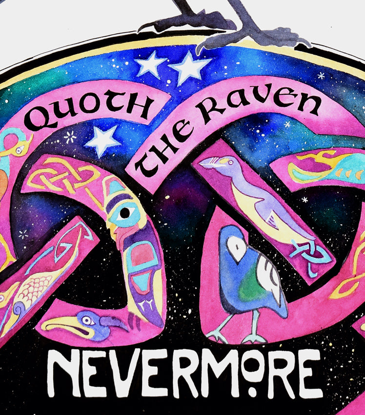 I used the celtic knot not only as visual reference to cultural history, but to illustrate that all life is interdependent and interwoven. I used motifs from the Lindisfarne gospels. Within the celtic knot, and among the stylised monastic birds, I have painted three extinct birds - the dodo, the great auk, and the passenger pigeon - all of which succumbed to human persecution. Gone forever, nevermore can we hear their song. They can't 'quoth' anything.