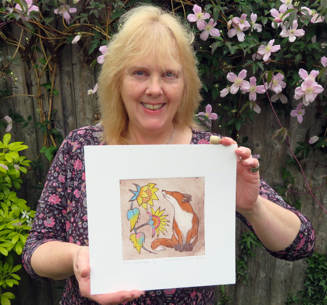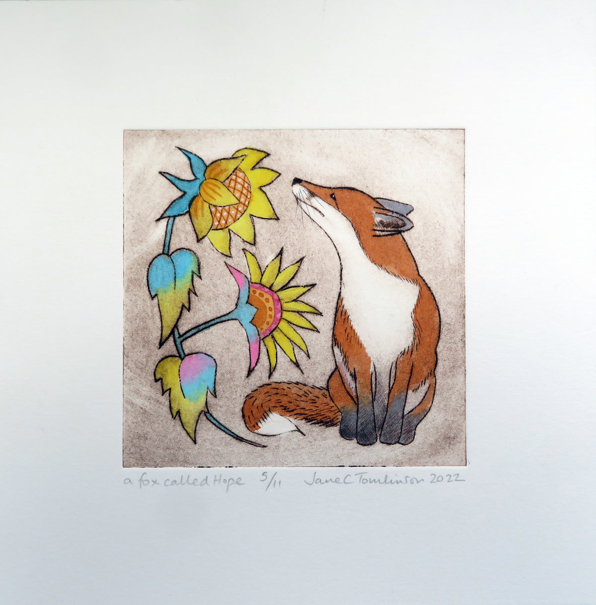 A Fox Called Hope is a drypoint painting tinted with watercolour of a red fox and two sunflowers in a folk art style.