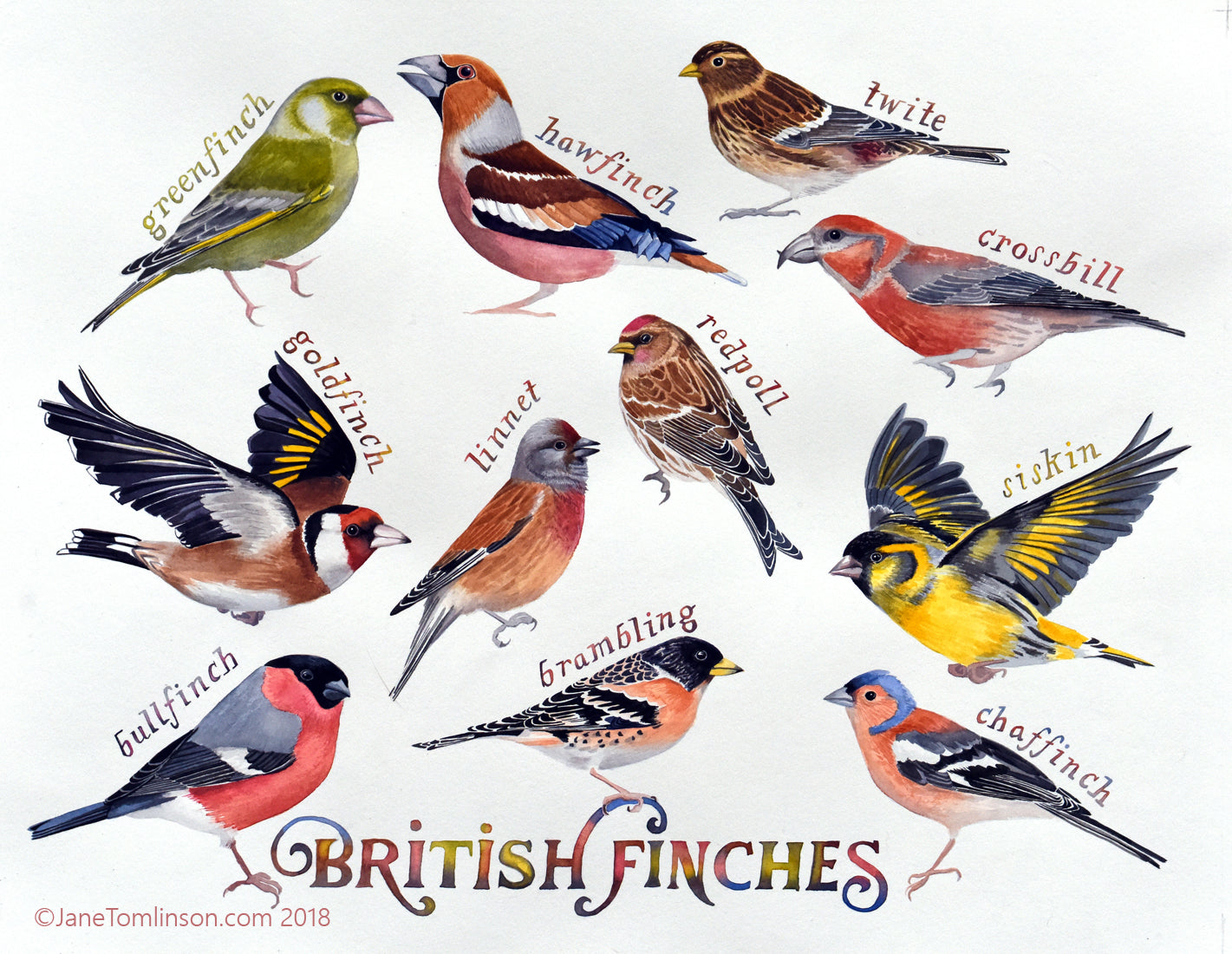 There are 11 species of British finches, all of which I have illustrated. Common ones include the chaffinch, goldfinch, linnet, siskin, redpoll and greenfinch. But less commonly seen are the bullfinch, crossbill, hawfinch, and twite.