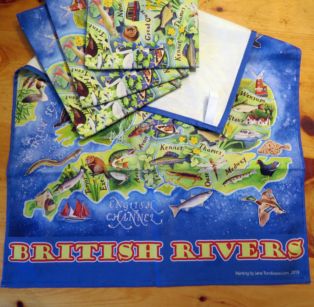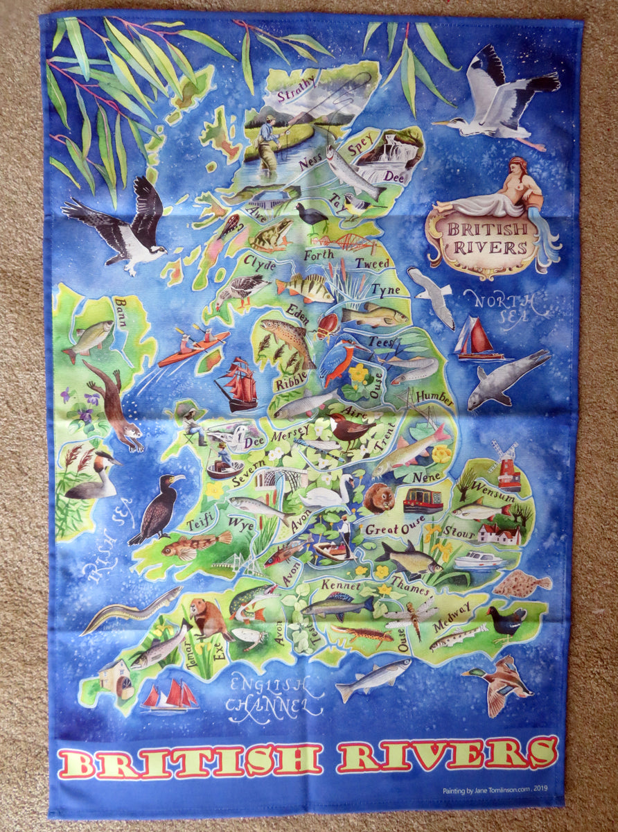 This classic British tea towel of my painting British Rivers, shows 35 rivers of Britain: