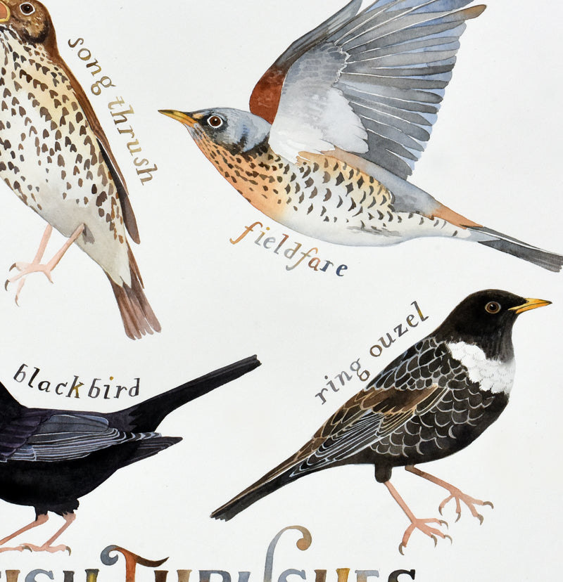 Thrushes are members of the Turdidae family, and I think some of the loveliest, most understated of birds, and have - to my eye - a classic bird shape. They mostly eat invertebrates and fruit. In my painting 'British thrushes' I have illustrated all six species of thrush resident in the British Isles: