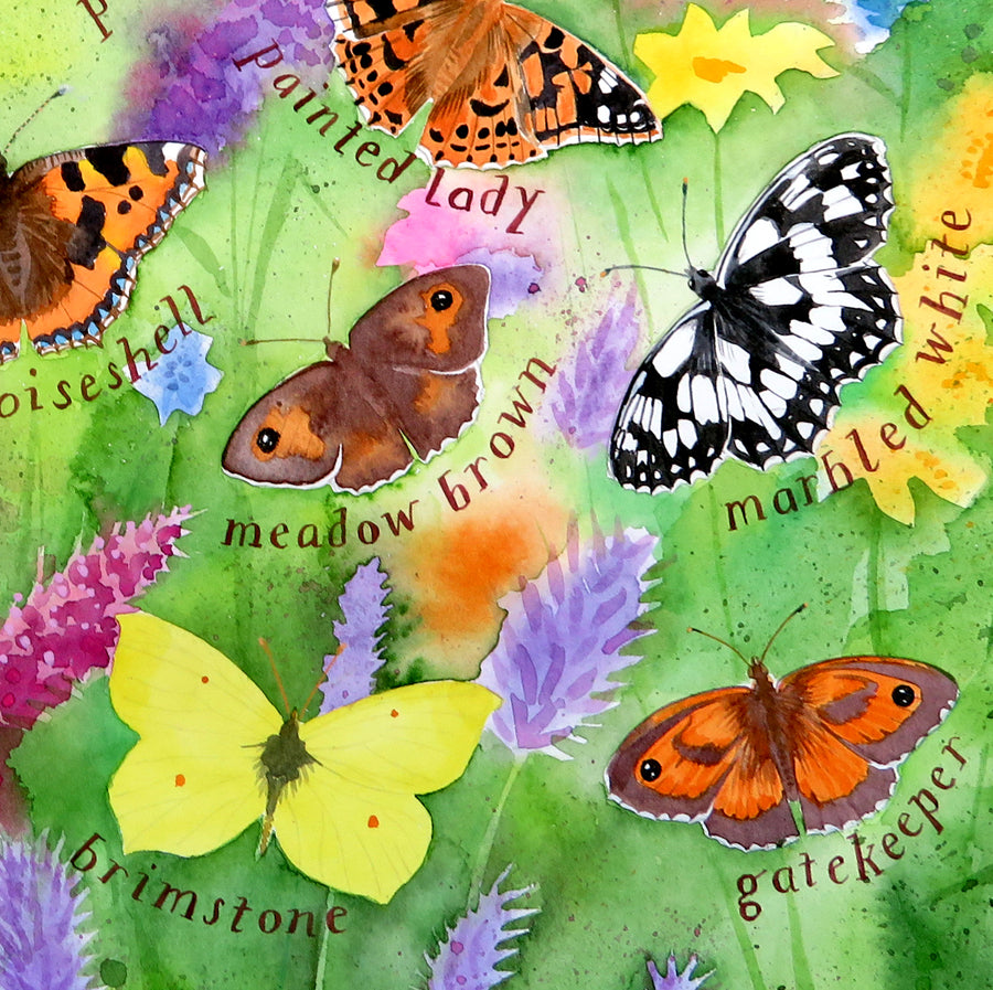 The butterflies shown are common blue, peacock, orange tip, ringlet, small tortoiseshell, painted laduy, comma, meadow brown, marbled white, red admiral, brimstone and gatekeeper.