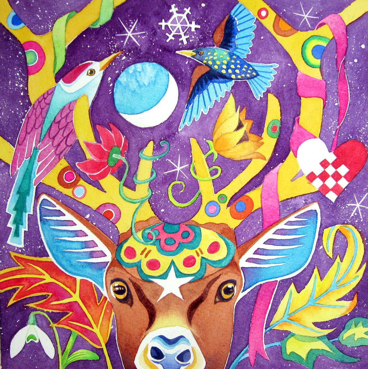 Folk deer is a design for a festive, secular greetings card. It features the face of a deer with his antlers festooned with birds and ribbons. There are one or two Swedish folk art references in there that the keen-eyed among you will notice.