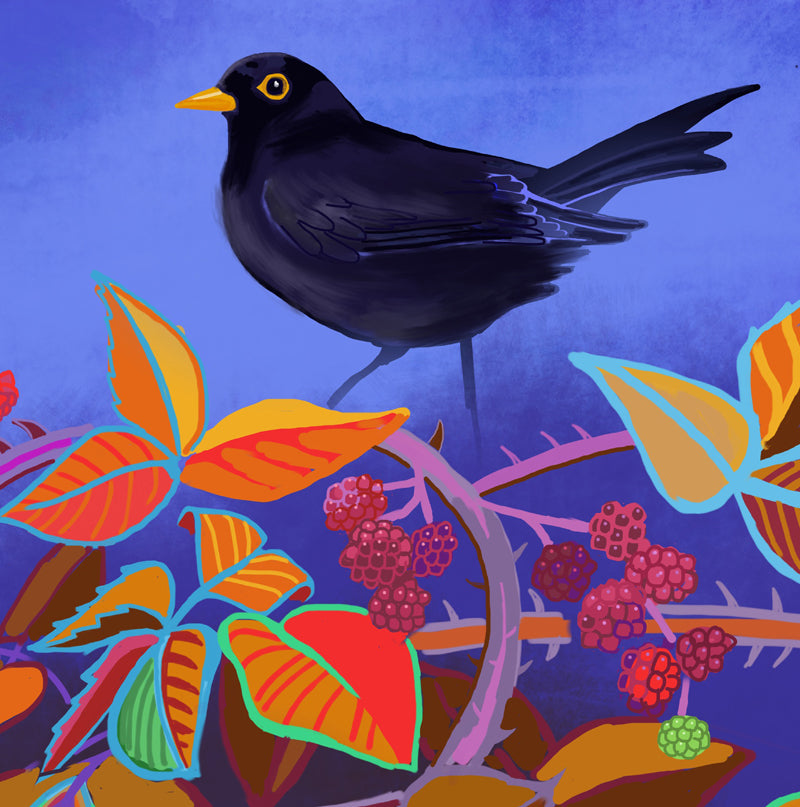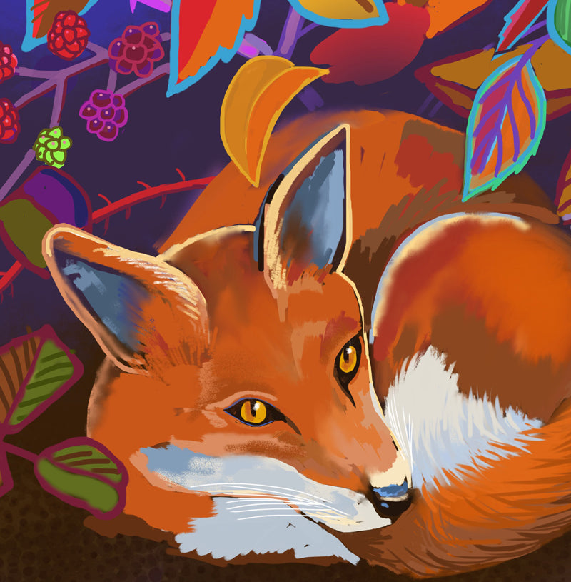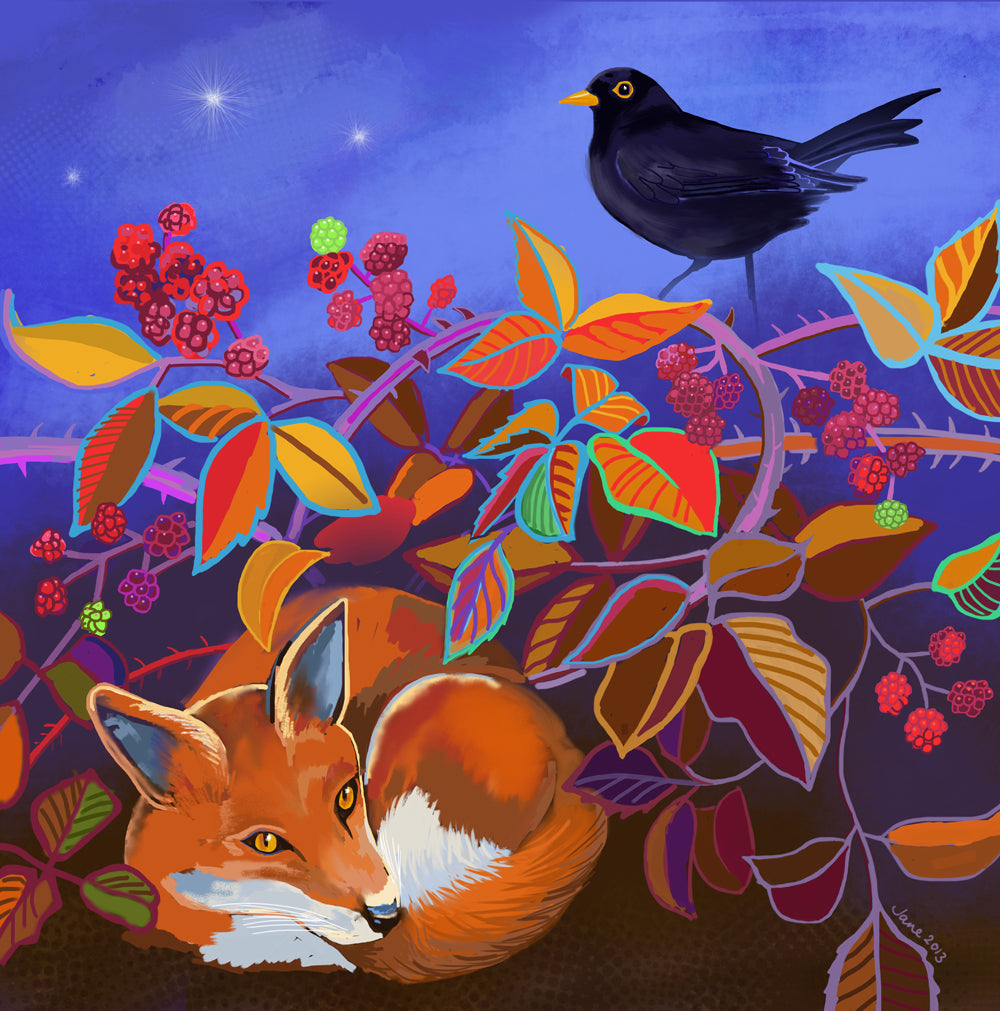 Fox and blackberries shows a red fox (Vulpes vulpes) lying beneath a tangle of brambles, having just been woken by a blackbird who has landed on a branch, come to eat the blackberries.