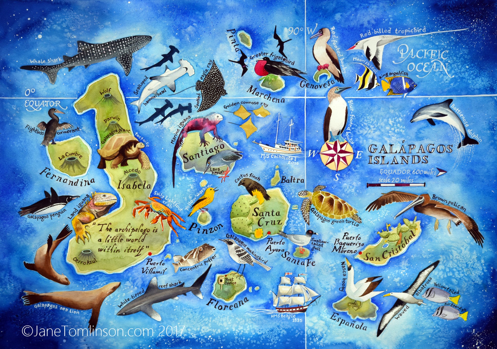 As a long-time painter of maps, my Galapagos Map was inevitable! When I was a tiny girl more than 50 years ago, my dad read me a book about evolution which had pictures of all the wonderful creatures of Galapagos. It's the place which inspired Charles Darwin to understand natural selection - the mechanism of evolution. The images in this book coupled with my father's enthusiasm for the natural world stayed with me - and blossomed! It had been a lifelong ambition to visit the 'Enchanted Isles', Finally, in 2016 we visited the archipelago.