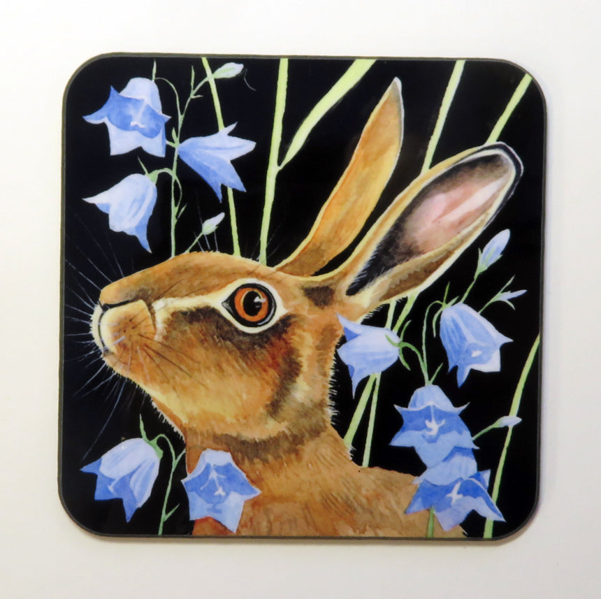This hardboard coaster features my painting of a brown hare with harebells. So pretty and look at those whiskers!