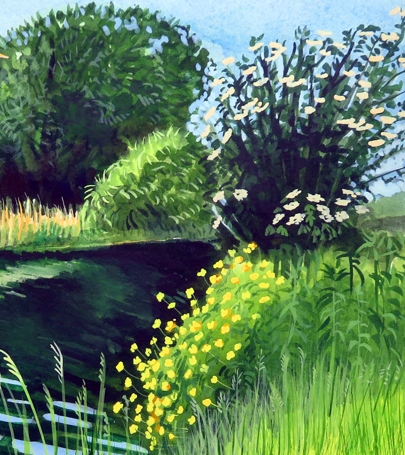 This view is of the Thames near Pinkhill in Oxfordshire in late May, showing willows now in full leaf, and reeds on the opposite river bank. On 'this' side of the river is an elder tree in bloom, and a yellow 'cloud' of wild mustard spilling over the bank.