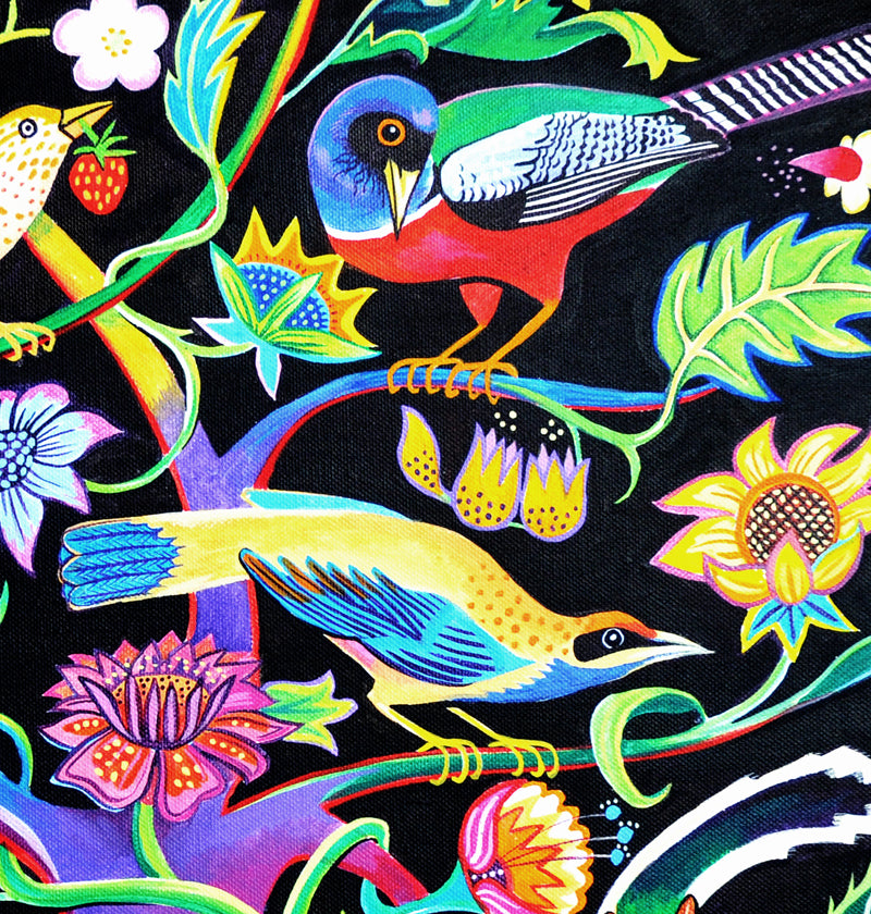 "In Birdland" is a painting which features many fond references to the genius of William Morris (1834 – 1896) such as the strawberry thief, as well as some glorious stylised sunflowers! It's available here as a signed print, size 420mm x420mm, and will add a splash of colour and life to any bare wall.