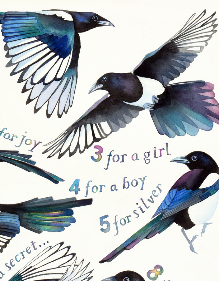 Magpie Song is a painting in watercolour and Indian ink illustrating the traditional rhyme.