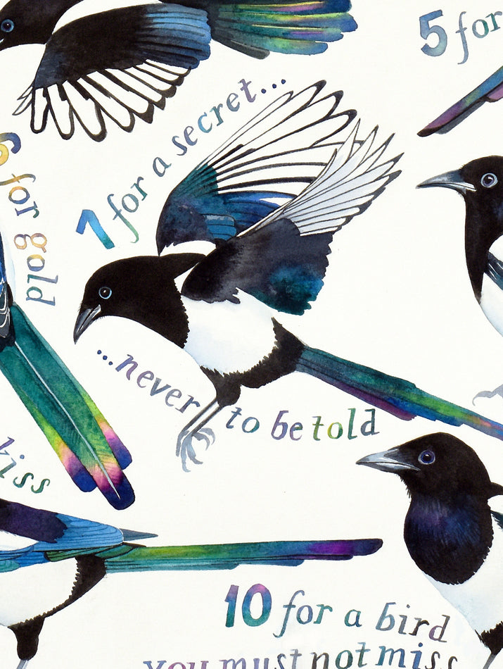 In folklore they are reckoned to be attracted to shiny objects, but there is no scientific proof for them being bling thieves. In my painting Magpie Song I have illustrated 10 birds from all angles to make the most of their gorgeous plumage and glossy, long tails. For a black and white bird, they are amazingly colourful - their plumage can appear green, blue and purple in certain light.