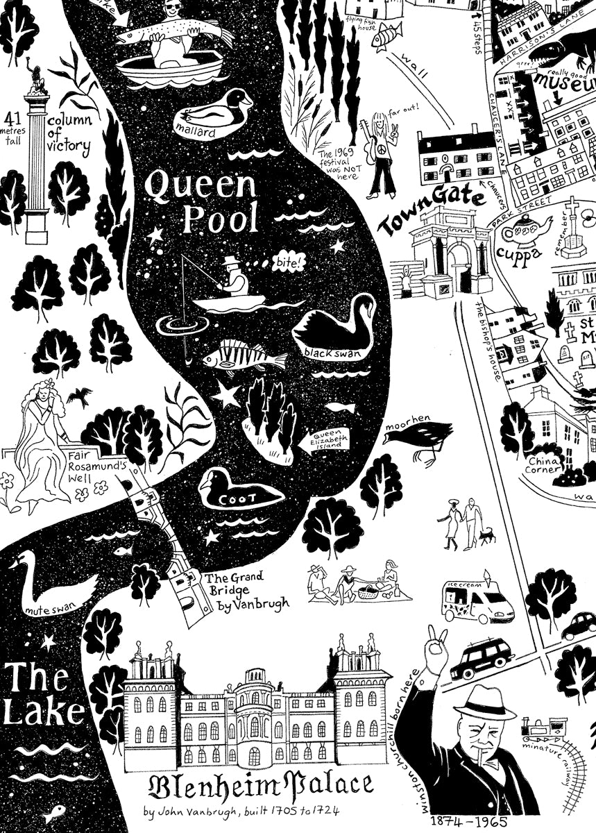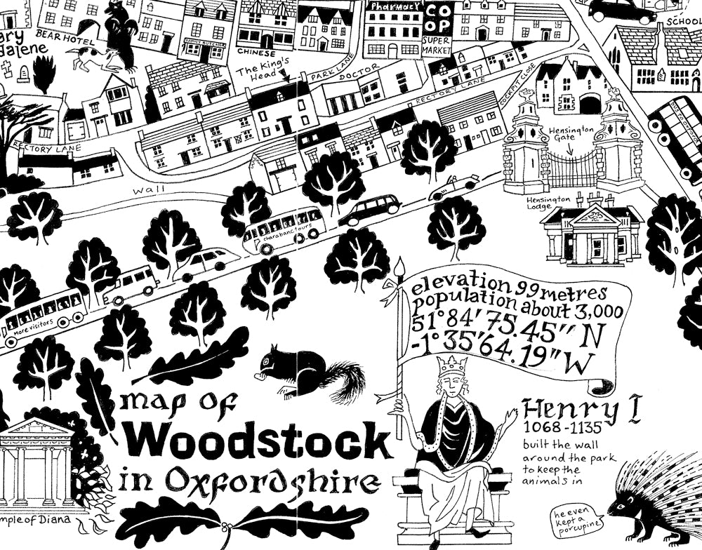 Of course I have put the obvious things in: Winston Churchill and Blenheim Palace, but also Henry I who first built the massive wall around the park to keep his animals in 900 years ago. I have even included a porcupine. which he apparently kept in his menagerie. Centuries later the royal menagerie moved to Regent’s Park in London and formed the foundation of London Zoo. This is just one little known fact about Woodstock. There are so many!