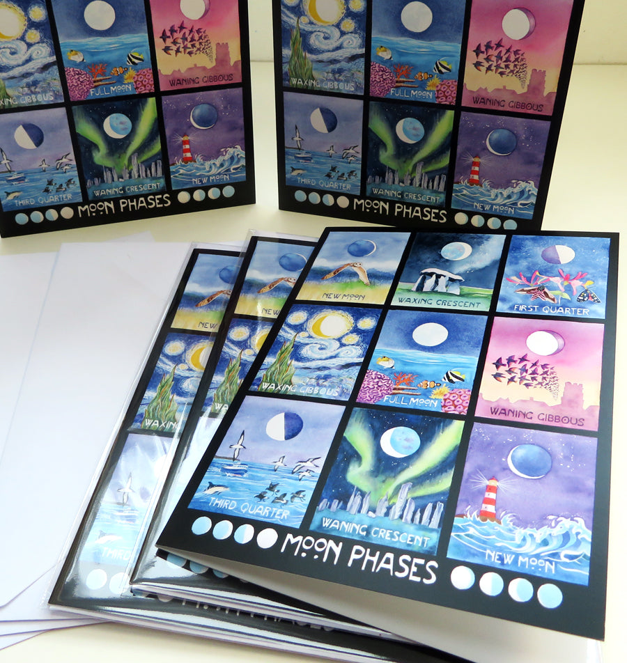 This Moon Phases greetings card features my painting of the eight lunar phases, plus an extra new moon to show how the cycle repeats itself.