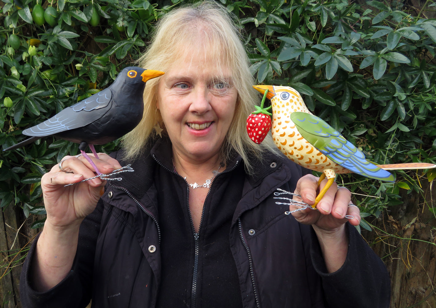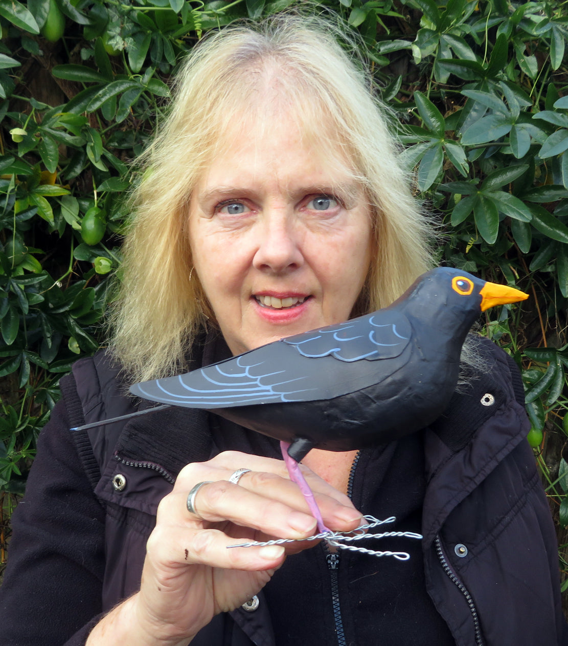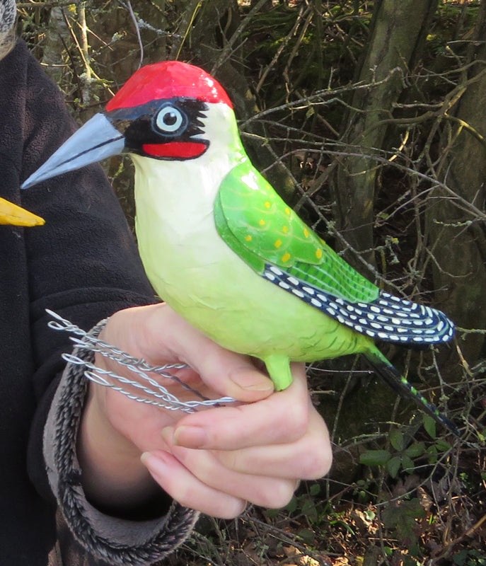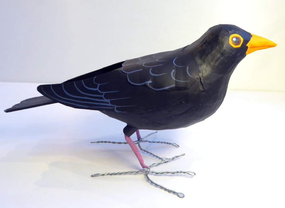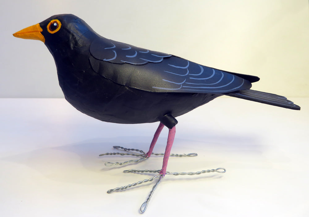 I construct them using PVA glue, and masking tape. I'm a whizz with a Stanley knife and I should say that some of these birds are fortified with splatterings of the artist's genuine A negative blood. Bird's legs are constructed using twisted garden wire. It's a very messy business - ripping and sticking - and I love it! Each bird is painted with artist's quality acrylic paint, and sealed with 3 coats of hardwearing acrylic varnish.