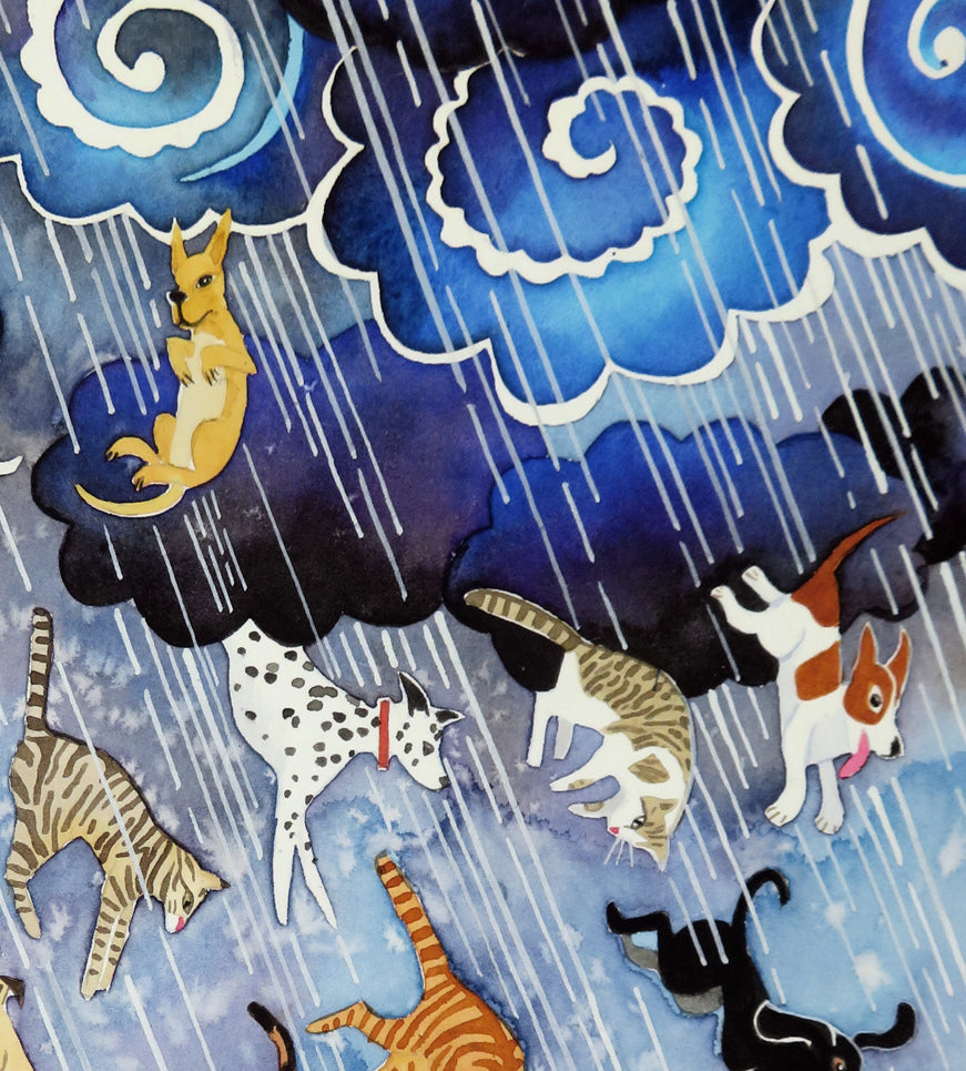 I like to paint the weather. So I thought I'd have a go at a 'Raining Cats and Dogs'. A couple of my own cats - Seafer and Skipper - make an appearance.
