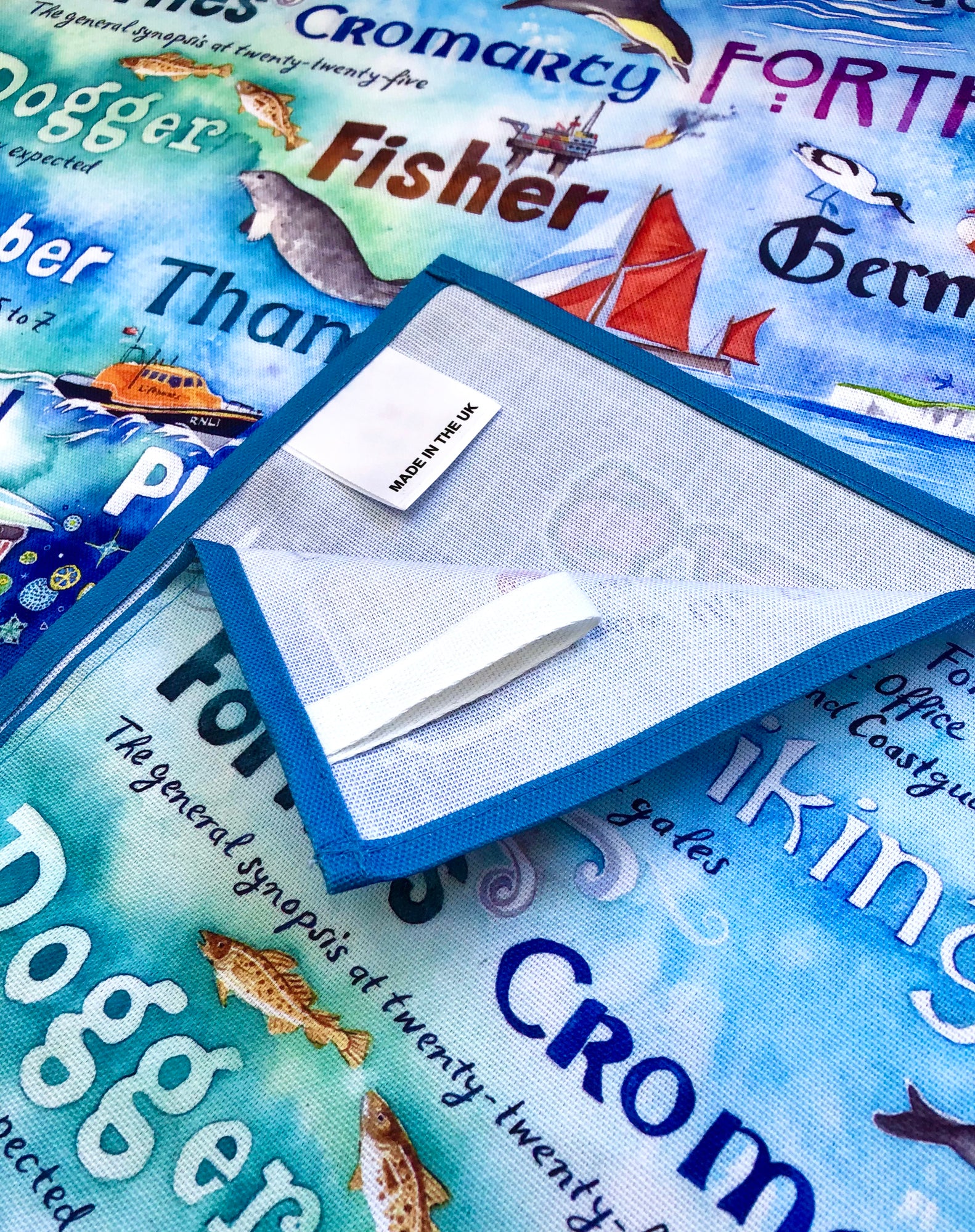 'Sailing By' tea towel - the words of the Shipping Forecast sea area names.