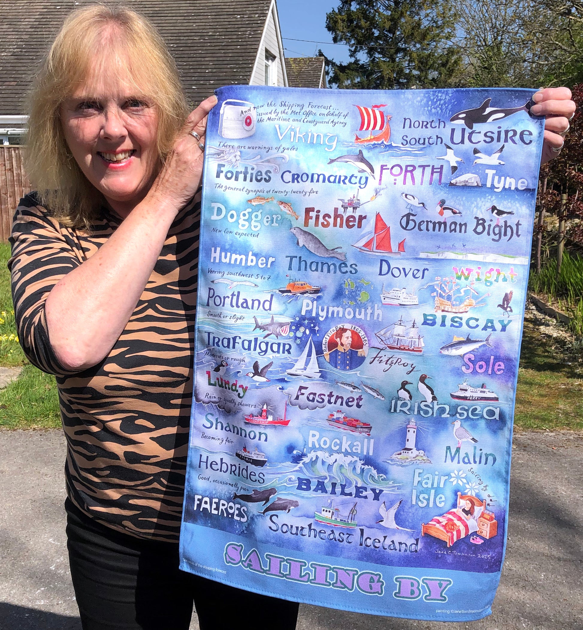 'Sailing By' is the title of the shipping forecast's theme tune, composed by Ronald Binge. Many people listen to the Shipping Forecast at bedtime, enjoying its calm, predictable poetry like a restful childhood storybook. My Sailing By tea towel will make drying up more restful and infinitely more interesting.