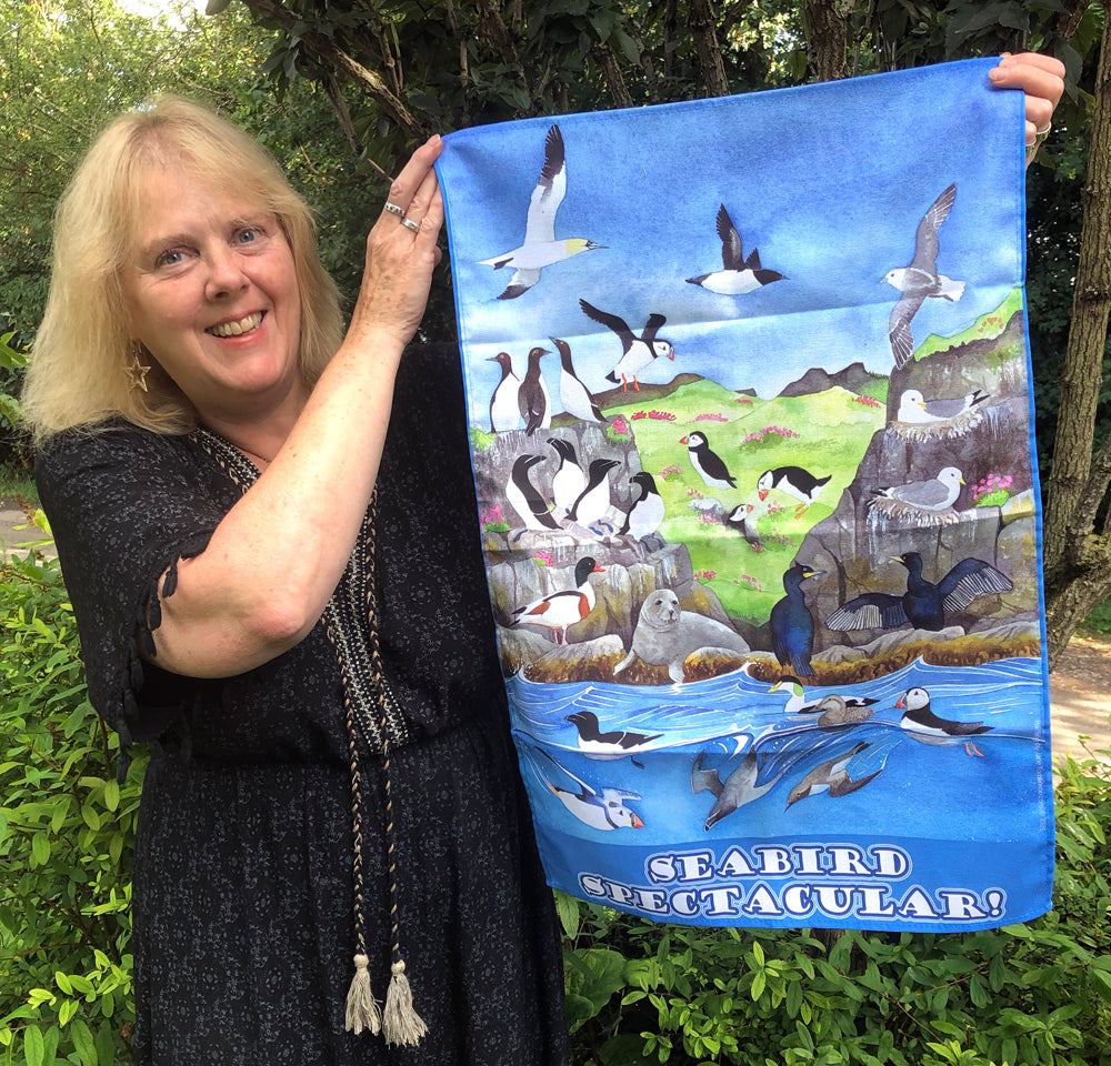 This seabirds tea towel features my painting Seabird Spectacular! It shows nine species of seabirds that can be seen around the coasts of the British Isles.