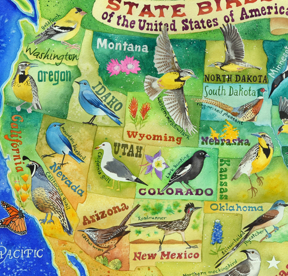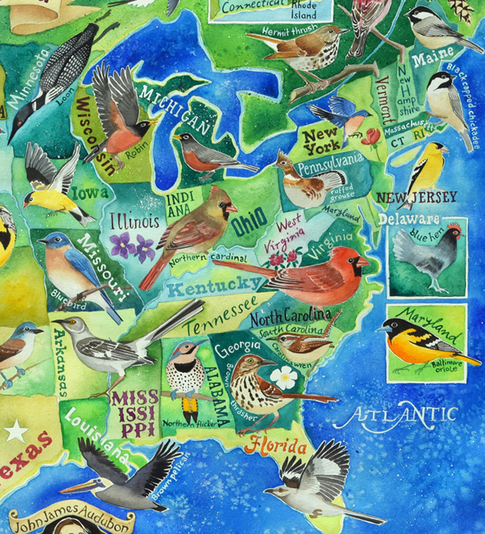 On my greetings cards of my hand painted map of state birds of the US, a small cameo of John James Audubon naturally appears at the foot of the painting.
