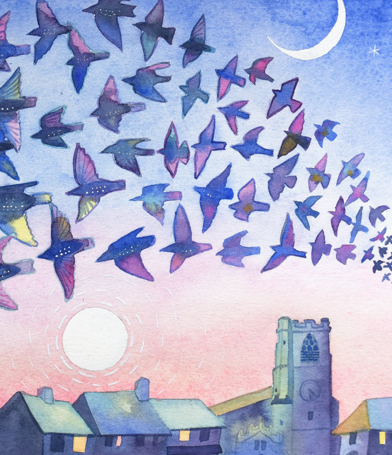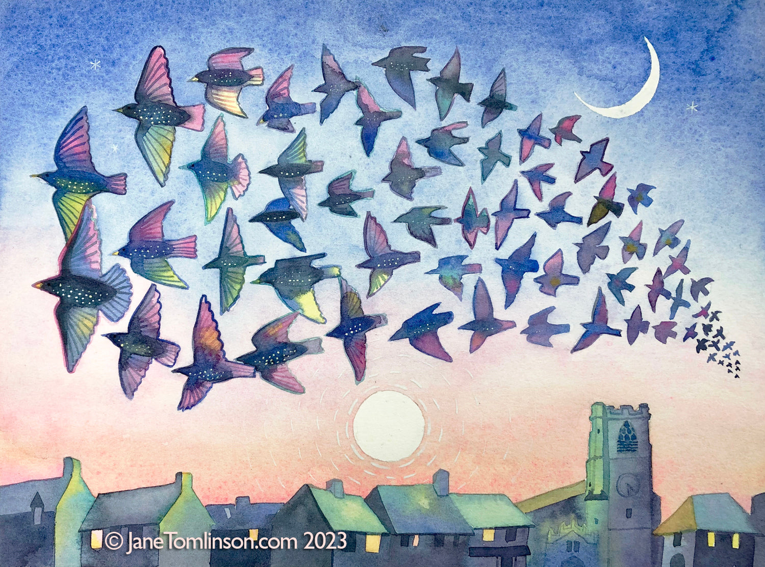 The painting in watercolour is of a murmuration of starlings (Sturnus vulgaris) swooping in over the village of Eynsham, Oxfordshire in 2023. We watched as the sun sank, and the new moon formed a crescent above the flock of birds approaching from the west.