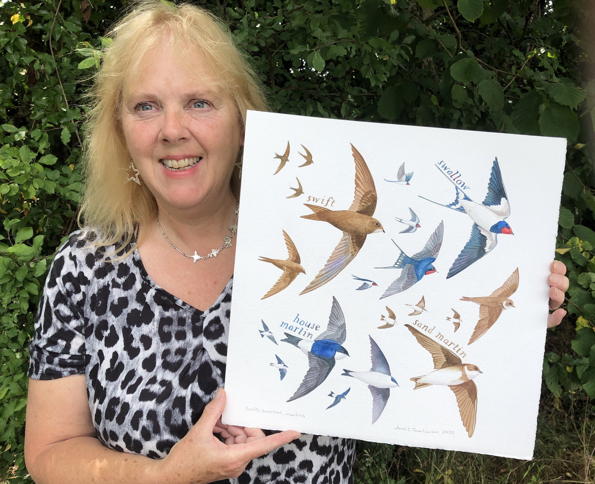 Swallows and martins belong to the hirundine family, and the swift is from the apodidae family. Their streamlined bodies, long, pointy wings and forked tails enable them to fly fast, catch insects in flight, and spend much of their lives on the wing. But as they whizz about they are not always easy to identify if you're not a birder. My painting aims to rectify this.