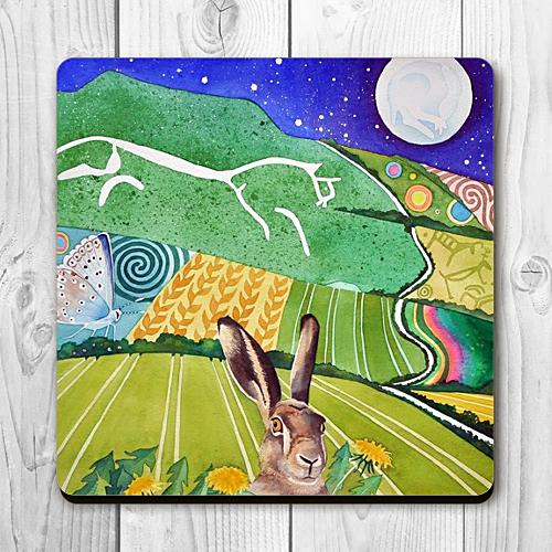 This hardboard coaster features my painting of 'White Horse Brown Hare', showing the a brown hare at the Uffington White Horse in Oxfordshire.